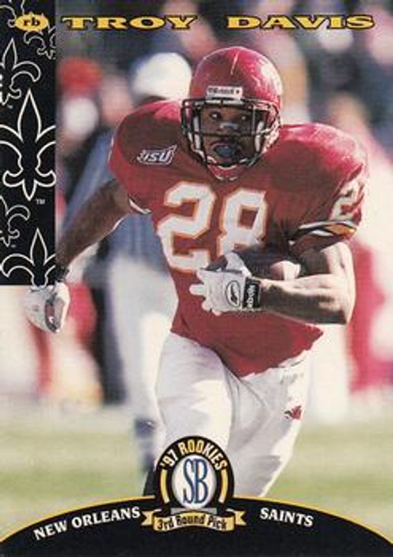 The Troy Davis 1997 Score Board Rookies #10 Base card is 1 of 7 Troy Davis' card variations in the 1997 Score Board Rookies set being tracked by Sports Card Investor, including #89 Base, #10 Dean's List, #89 Dean's List, #V22 Varsity Club, and #WR18 War Room.