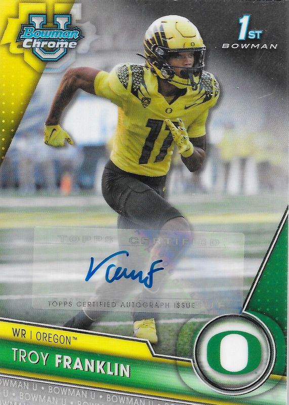 This card is 1 of 12 Troy Franklin's card variations in the 2023 Bowman Chrome University set being tracked by Sports Card Investor, including Prospect Auto - Refractor /499 (1st), Prospect Auto - Fuchsia Mini-Diamond Refractor /150 (1st), Prospect Auto - Green Refractor /99 (1st), Prospect Auto - Yellow Refractor /75 (1st), and Prospect Auto - Gold Lava Refractor /50 (1st).
