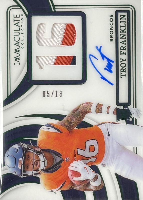 The Troy Franklin 2024 Immaculate #NRPA-TFN Immaculate Numbers Rookie Patch Autographs - Emerald /18 card in Raw condition has not changed in price in the last 30 days and was last sold for $55.99 .