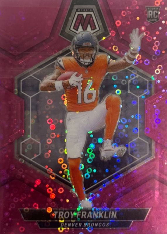 This card is 1 of 61 Troy Franklin's card variations in the 2024 Mosaic set being tracked by Sports Card Investor, including Base, Green, Mosaic, No Huddle, and Pink Camo.