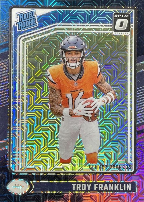 This card is 1 of 58 Troy Franklin's card variations in the 2024 Optic set being tracked by Sports Card Investor, including Base, Blue Hyper, Blue Scope, Green Hyper, and Green Velocity.