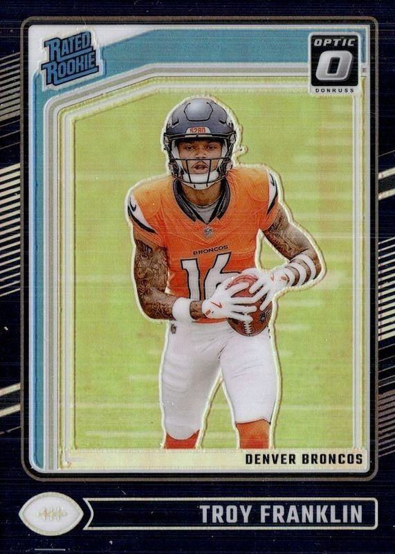 This card is 1 of 58 Troy Franklin's card variations in the 2024 Optic set being tracked by Sports Card Investor, including Base, Blue Hyper, Blue Scope, Green Hyper, and Green Velocity.