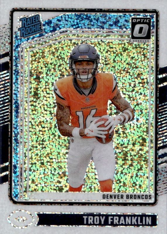This card is 1 of 58 Troy Franklin's card variations in the 2024 Optic set being tracked by Sports Card Investor, including Base, Blue Hyper, Blue Scope, Green Hyper, and Green Velocity.