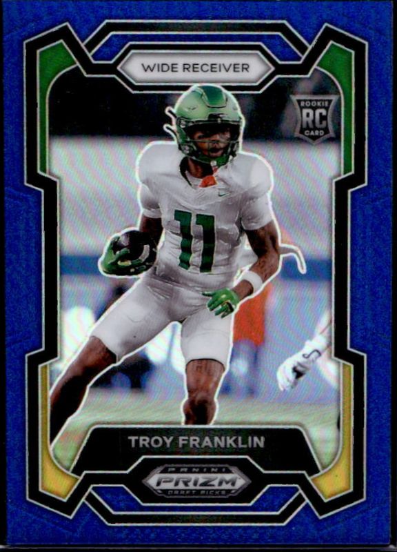 The Troy Franklin 2024 Prizm Draft Picks #119 Blue /199 Rookie card is 1 of 137 Troy Franklin's card variations in the 2024 Prizm Draft Picks set being tracked by Sports Card Investor, including Base, Green, Purple Wave, Red Ice, and Ruby Wave.