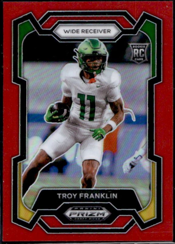 The Troy Franklin 2024 Prizm Draft Picks #119 Red /299 Rookie card is 1 of 137 Troy Franklin's card variations in the 2024 Prizm Draft Picks set being tracked by Sports Card Investor, including Base, Green, Purple Wave, Red Ice, and Ruby Wave.