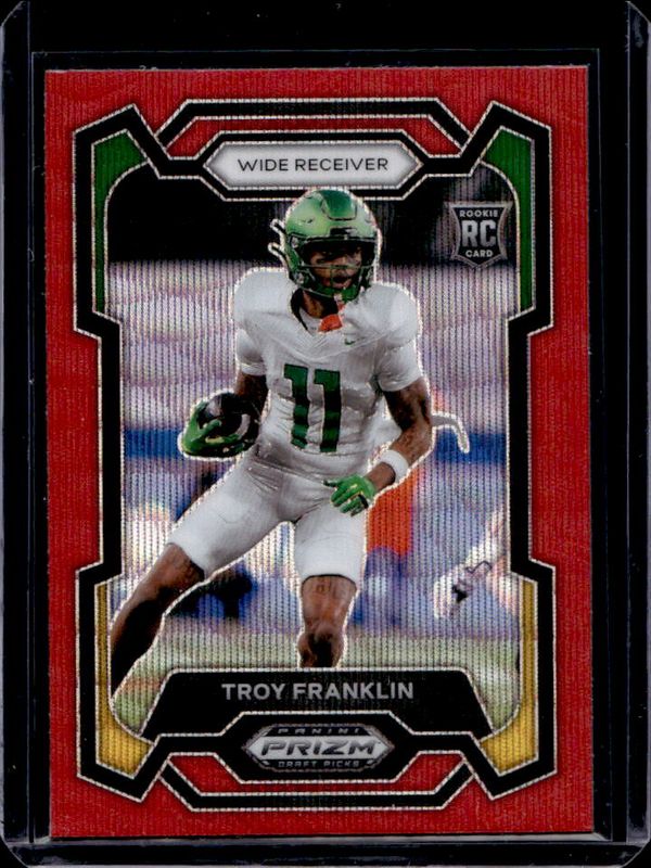 The Troy Franklin 2024 Prizm Draft Picks #119 Ruby Wave Rookie card is 1 of 137 Troy Franklin's card variations in the 2024 Prizm Draft Picks set being tracked by Sports Card Investor, including Base, Green, Purple Wave, Red Ice, and Silver.