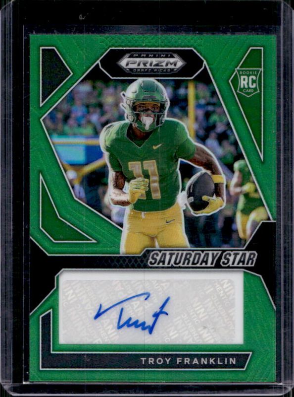 The Troy Franklin 2024 Prizm Draft Picks #SSS-TFN Saturday Star Signatures - Green Rookie card is 1 of 137 Troy Franklin's card variations in the 2024 Prizm Draft Picks set being tracked by Sports Card Investor, including Base, Green, Purple Wave, Red Ice, and Ruby Wave.