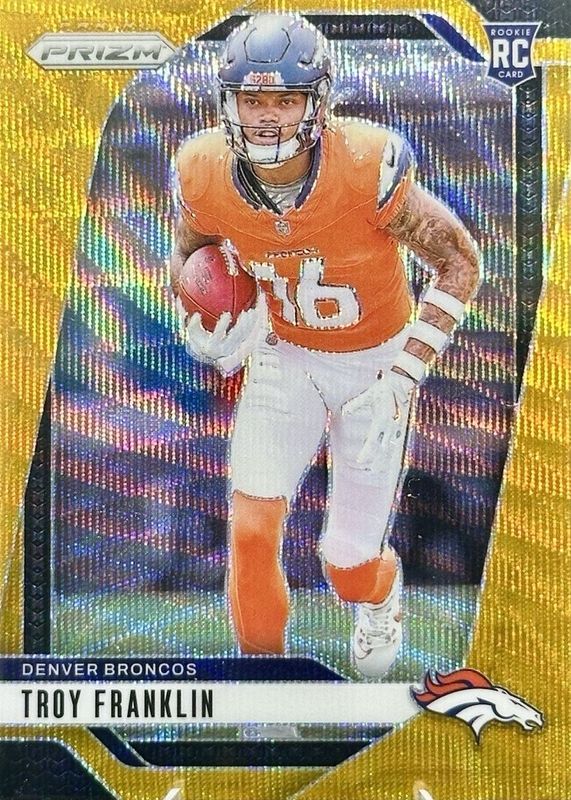The Troy Franklin 2024 Prizm #393 Gold Wave /10 Rookie card in Raw condition has not changed in price in the last 30 days and was last sold for $114.99 .