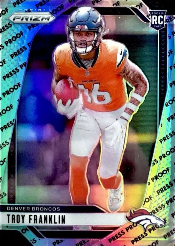 The Troy Franklin 2024 Prizm #393 Press Proof /(SSP) Rookie card in Raw condition has not changed in price in the last 30 days and was last sold for $75.00 .