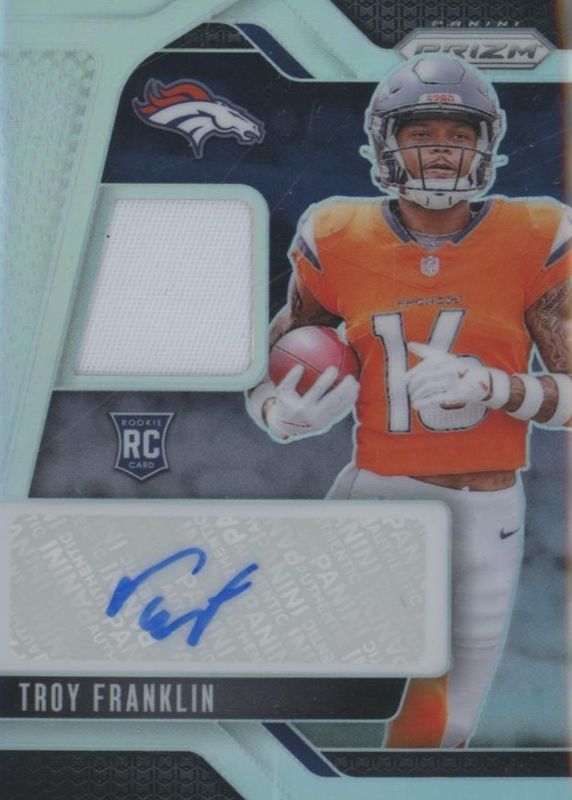 The Troy Franklin 2024 Prizm #RPA-TFN Rookie Patch Auto - Silver /99 card in Raw condition has not changed in price in the last 30 days and was last sold for $34.99 .