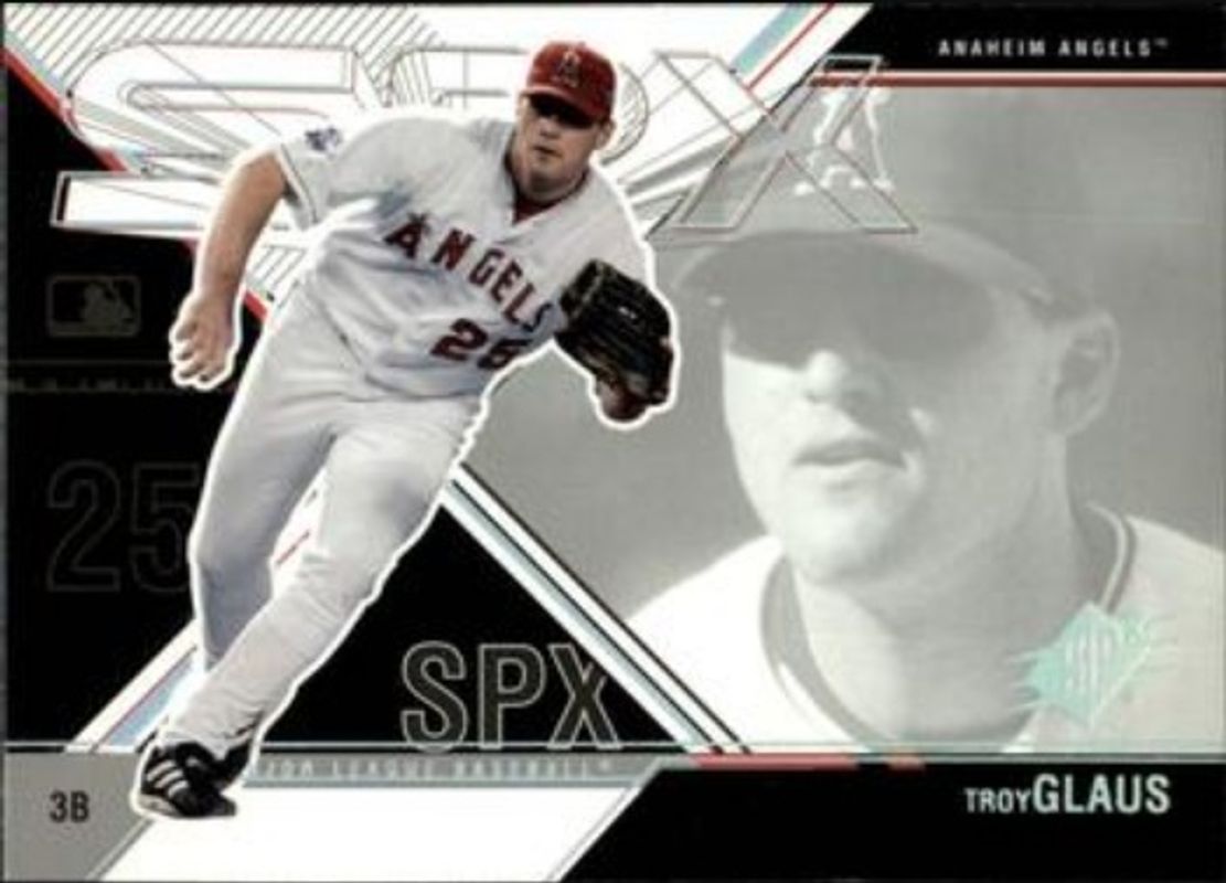 The Troy Glaus 2003 SPx #4 Base /999 card is 1 of 12 Troy Glaus' card variations in the 2003 SPx set being tracked by Sports Card Investor, including #4 Spectrum /25, #WM-TR1a Winning Materials /375, #WM-TR1b Winning Materials /375, #WM-TR1a Winning Materials /250, and #WM-TR1b Winning Materials /250.