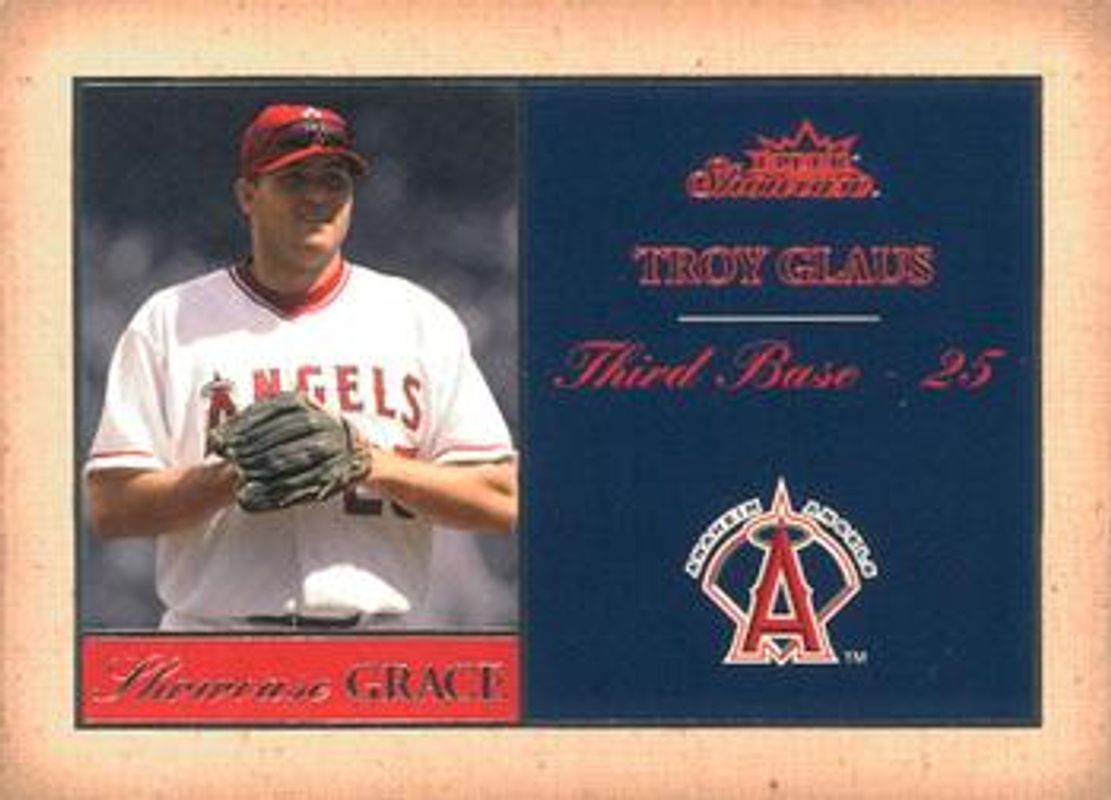 The Troy Glaus 2004 Fleer Showcase #10-SG Showcase Grace card is 1 of 4 Troy Glaus' card variations in the 2004 Fleer Showcase set being tracked by Sports Card Investor, including Base, Legacy Collection /99, and Masterpiece Collection /1.