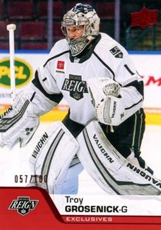 The Troy Grosenick 2020 Upper Deck AHL #128 UD Exclusives /100 card is 1 of 9 Troy Grosenick's card variations in the 2020 Upper Deck AHL set being tracked by Sports Card Investor, including Base, UD High Gloss /10, Autographs, Blue, and Printing Plates Black /1.
