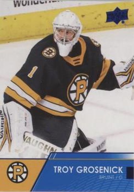 The Troy Grosenick 2021 Upper Deck AHL #47 Blue card is 1 of 9 Troy Grosenick's card variations in the 2021 Upper Deck AHL set being tracked by Sports Card Investor, including Base, Exclusives /100, High Gloss /10, Autographs, and Printing Plates - Black /1.