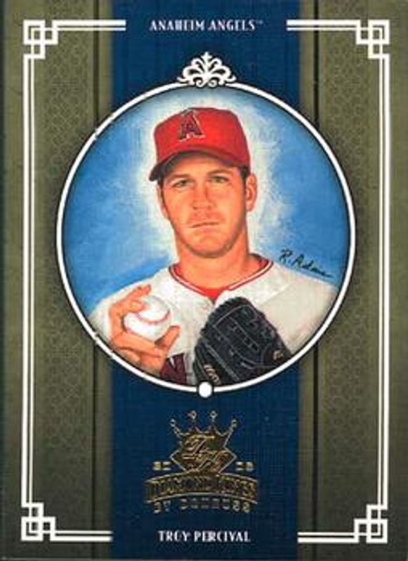 The Troy Percival 2005 Diamond Kings #10 Base card is 1 of 45 Troy Percival's card variations in the 2005 Diamond Kings set being tracked by Sports Card Investor, including Framed Red, Non Canvas, Framed Blue /100, Bronze /50, and Framed Green /50.