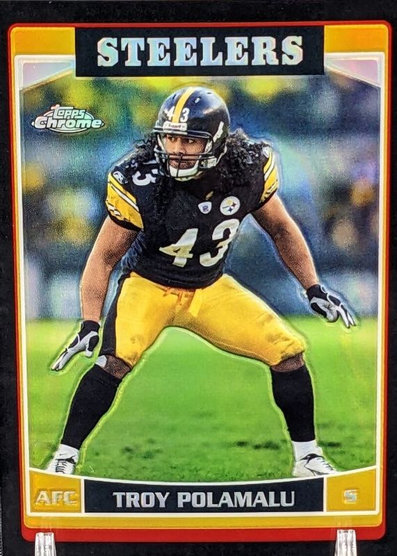 This card is 1 of 4 Troy Polamalu's card variations in the 2006 Topps Chrome set being tracked by Sports Card Investor, including Refractor, Red Refractor /259, and Blue /50.