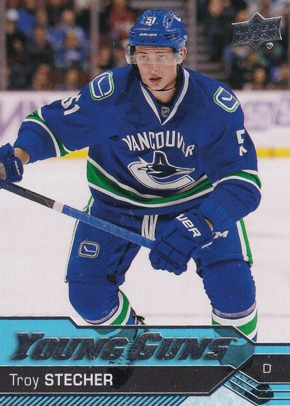 This card is 1 of 8 Troy Stecher's card variations in the 2016 Upper Deck set being tracked by Sports Card Investor, including Young Guns - Clear Cut, Young Guns - Gold Rainbow Foil, Young Guns - Jumbo, Young Guns - Silver Foil, and Young Guns - UD Exclusives /100.