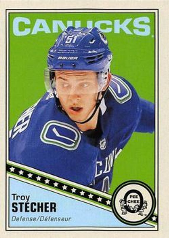 The Troy Stecher 2019 O-Pee-Chee #225 Retro Blank Back card is 1 of 8 Troy Stecher's card variations in the 2019 O-Pee-Chee set being tracked by Sports Card Investor, including Base, Blue Border, Gold Border, Red Border, and Red Border Blank Back.