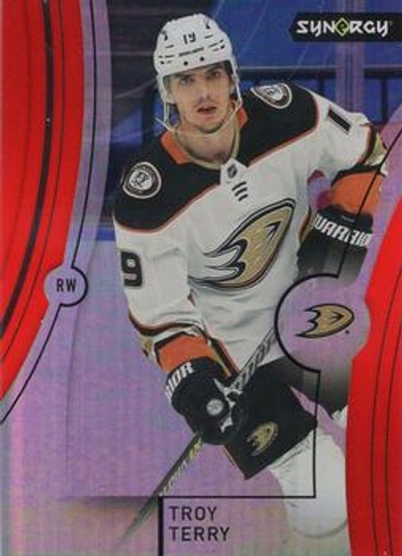 The Troy Terry 2021 Upper Deck Synergy #3 Red Codes card is 1 of 20 Troy Terry's card variations in the 2021 Upper Deck Synergy set being tracked by Sports Card Investor, including Base /22, Red, Purple /49, Autographs, and Autographs Mystery Black Achievements.