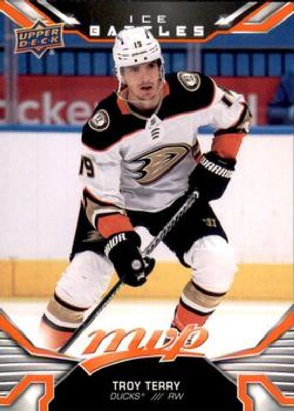 The Troy Terry 2022 Upper Deck MVP #40 Ice Battles card is 1 of 31 Troy Terry's card variations in the 2022 Upper Deck MVP set being tracked by Sports Card Investor, including Base, Blue Script, Gold Script, Silver Script, and Super Script /25.