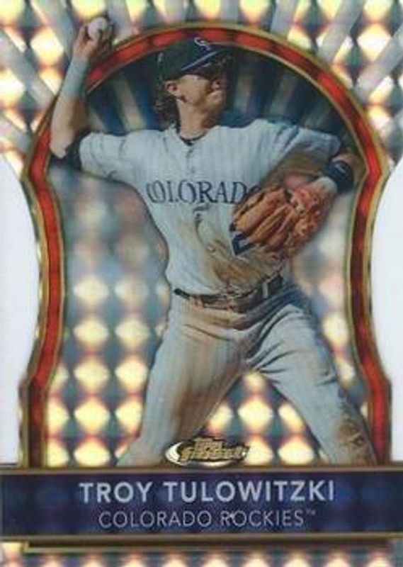The Troy Tulowitzki 2011 Topps Finest #15 Die-Cut Mosaic Refractor /10 card is 1 of 18 Troy Tulowitzki's card variations in the 2011 Topps Finest set being tracked by Sports Card Investor, including Base, Refractor /549, X-Fractor /299, Green Refractor /199, and Orange Refractor /99.