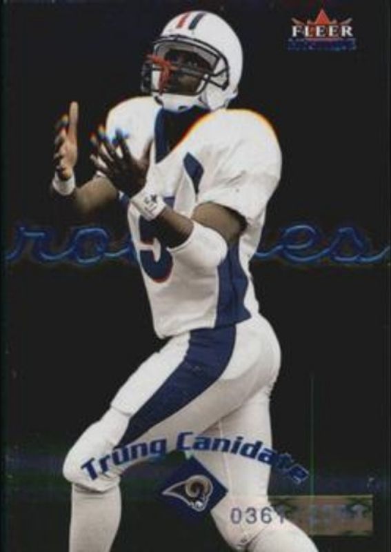 The Trung Canidate 2000 Fleer Mystique #107 Base /2000 Rookie card is 1 of 3 Trung Canidate's card variations in the 2000 Fleer Mystique set being tracked by Sports Card Investor, including Gold /500, and Masterpiece /1.
