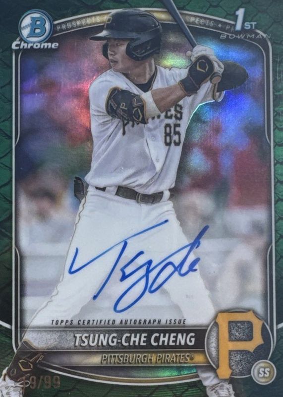 Best Prices Available For Sale of Tsung-Che Cheng 2025 Bowman #CPA-TC Chrome Prospect Auto - Reptilian Green Refractor /99 (1st)
