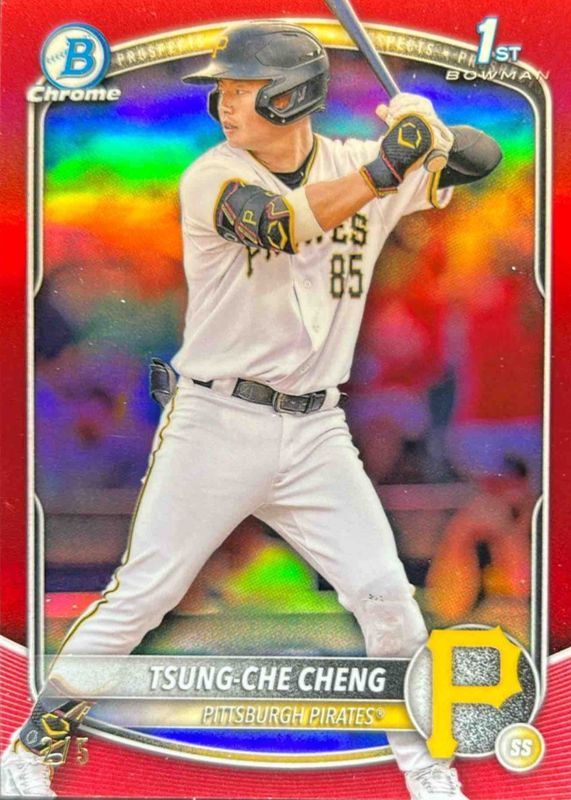 The Tsung-Che Cheng 2025 Bowman #BCP-95 Chrome Prospects - Red Refractor /5 (1st) Rookie card in Raw condition has not changed in price in the last 30 days and was last sold for $152.00 .