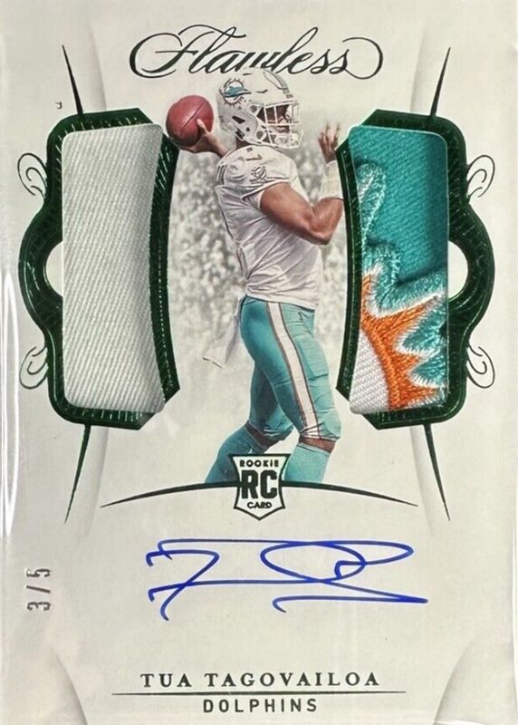 The Tua Tagovailoa 2020 Flawless #RDPA-TT Rookie Dual Patch Auto - Emerald /5 card in Raw condition has not changed in price in the last 30 days.