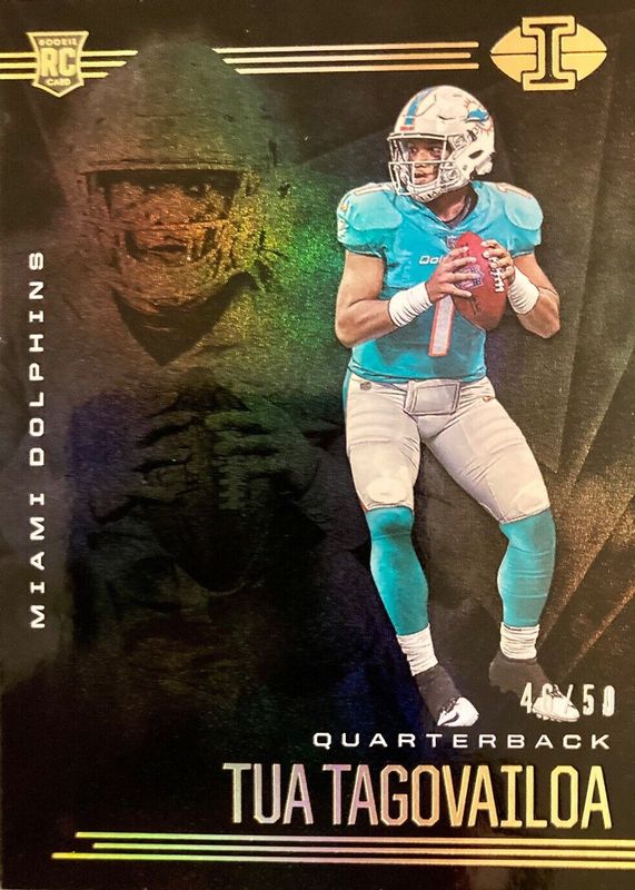 The Tua Tagovailoa 2020 Illusions #6 Trophy Collection Black /50 Rookie card in Raw condition has not changed in price in the last 30 days and was last sold for $40.00 .