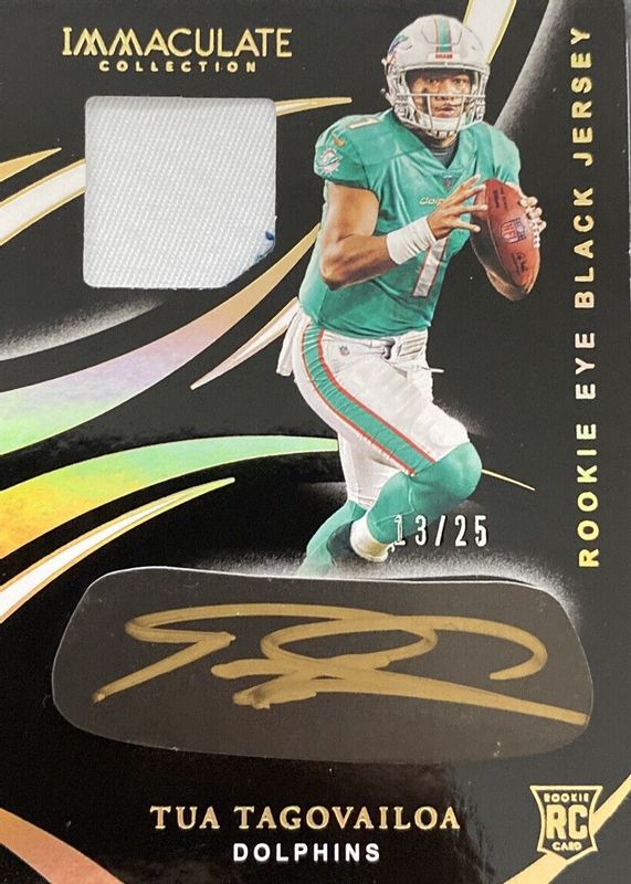 The Tua Tagovailoa 2020 Immaculate #REB-2 Immaculate Rookie Eye Black Jersey Autographs - Gold /25 card in Raw condition has not changed in price in the last 30 days and was last sold for $124.50 .