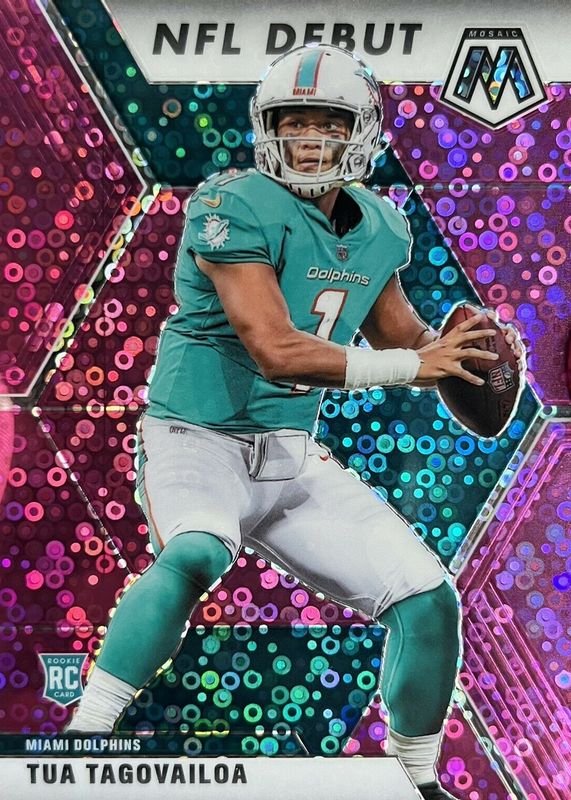The Tua Tagovailoa 2020 Mosaic #262 NFL Debut - No Huddle Pink /20 Rookie card in Raw condition has not changed in price in the last 30 days and was last sold for $56.00 .