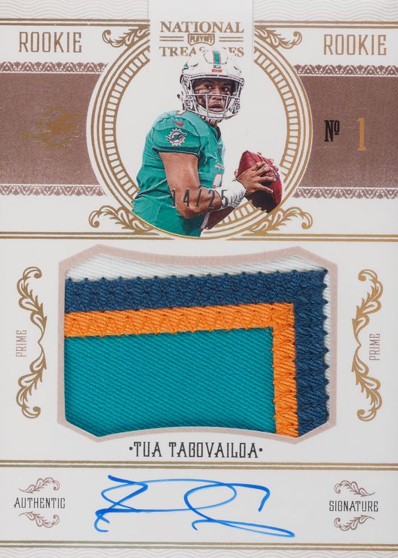 This card is 1 of 49 Tua Tagovailoa's card variations in the 2020 National Treasures set being tracked by Sports Card Investor, including Rookie Patch Auto /99, Rookie Patch Auto - Green Jersey Number (/1), Rookie Patch Auto - Holo Silver /25, Rookie Patch Auto - Midnight /20, and Rookie Patch Auto - Stars & Stripes /20.