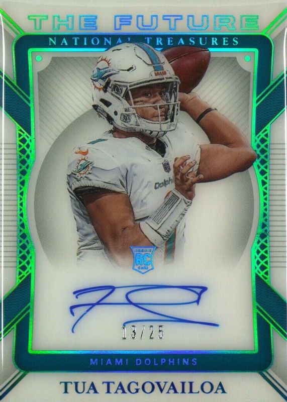 The Tua Tagovailoa 2020 National Treasures #TF-TT The Future Autographs /25 Rookie card in Raw condition has not changed in price in the last 30 days and was last sold for $129.50 .