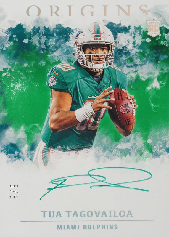 This card is 1 of 9 Tua Tagovailoa's card variations in the 2020 Origins set being tracked by Sports Card Investor, including Rookie Autographs, Rookie Autographs - Red /99, Rookie Autographs - Blue /49, Rookie Autographs - Turquoise /25, and Rookie Autographs - Purple FOTL /17.