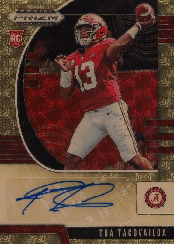 The Tua Tagovailoa 2020 Prizm Draft Picks #101 Autographs - Gold Vinyl /5 Rookie card in Raw condition has not changed in price in the last 30 days and was last sold for $890.00 .