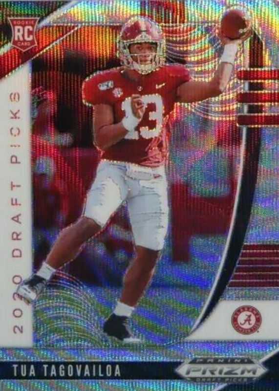 The Tua Tagovailoa 2020 Prizm Draft Picks #101 Blue Wave /299 Rookie card in Raw condition has not changed in price in the last 30 days and was last sold for $9.99 .