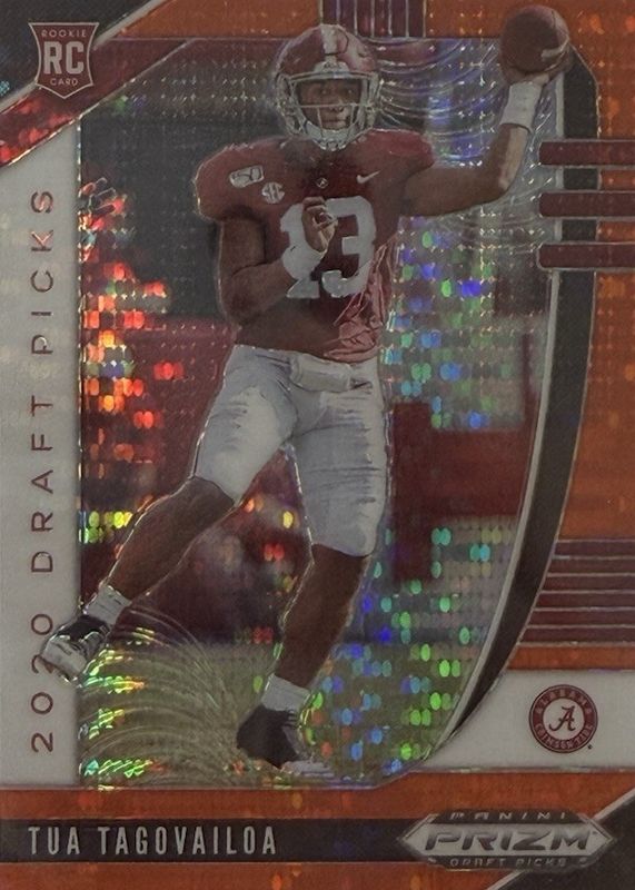 This card is 1 of 51 Tua Tagovailoa's card variations in the 2020 Prizm Draft Picks set being tracked by Sports Card Investor, including Base, Blue, Green, Orange, and Pink Pulsar.