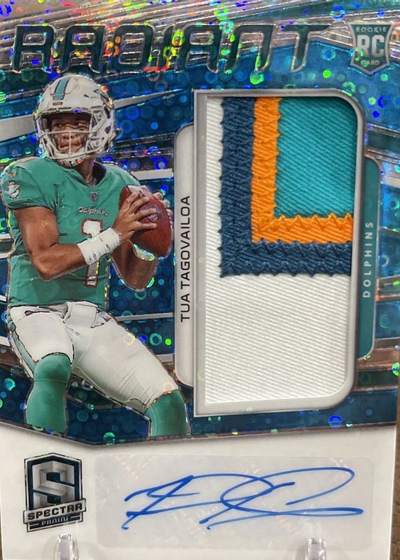 The Tua Tagovailoa 2020 Spectra #1 Radiant Rookie Patch Signatures - Neon Pink (/10) card in Raw condition has not changed in price in the last 30 days and was last sold for $224.50 .
