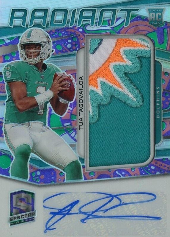 This card is 1 of 33 Tua Tagovailoa's card variations in the 2020 Spectra set being tracked by Sports Card Investor, including Base /99, Radiant Rookie Patch Signatures (/35), Radiant Rookie Patch Signatures - Hyper (/30), Radiant Rookie Patch Signatures - Neon Black Light (/5), and Radiant Rookie Patch Signatures - Neon Blue (/25).