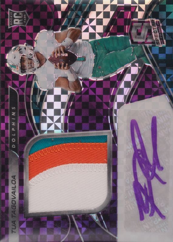 The Tua Tagovailoa 2020 Spectra #202 Rookie Patch Auto - Neon Purple /35 card in Raw condition has not changed in price in the last 30 days and was last sold for $330.00 .