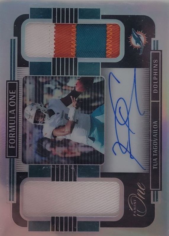 This card is 1 of 7 Tua Tagovailoa's card variations in the 2021 One set being tracked by Sports Card Investor, including Formula One Autographs - Blue (/6), Formula One Autographs - Bronze (/5), Formula One Autographs - Gold (/3), Formula One Autographs - Platinum (/2), and Formula One Autographs - Red (/4).