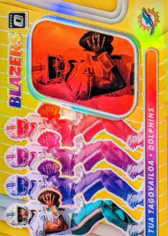This card is 1 of 10 Tua Tagovailoa's card variations in the 2022 Optic set being tracked by Sports Card Investor, including Blazers /(SSP), Mythical /(SSP), Blazers - Black Pandora /25, Mythical - Black Pandora /25, and Mythical - Gold /10.