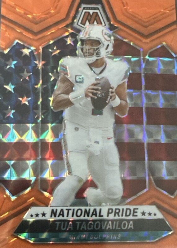 The Tua Tagovailoa 2024 Mosaic #251 National Pride - Orange Fluorescent /25 card in Raw condition has not changed in price in the last 30 days and was last sold for $15.00 .