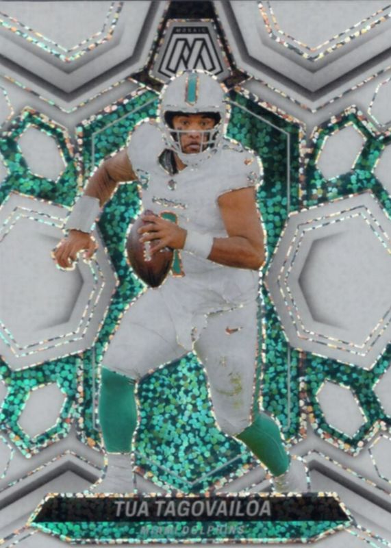 This card is 1 of 49 Tua Tagovailoa's card variations in the 2024 Mosaic set being tracked by Sports Card Investor, including Choice Peacock /(SSP), Genesis /(SSP), Honeycomb /(SSP), National Pride - Choice Peacock /(SSP), and National Pride - Genesis /(SSP).
