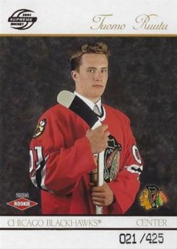 The Tuomo Ruutu 2003 Pacific Supreme #111 Red /425 Rookie card is 1 of 5 Tuomo Ruutu's card variations in the 2003 Pacific Supreme set being tracked by Sports Card Investor, including #111 Base /775, #111b Base /775, #111 Retail, and #111 Blue /250.