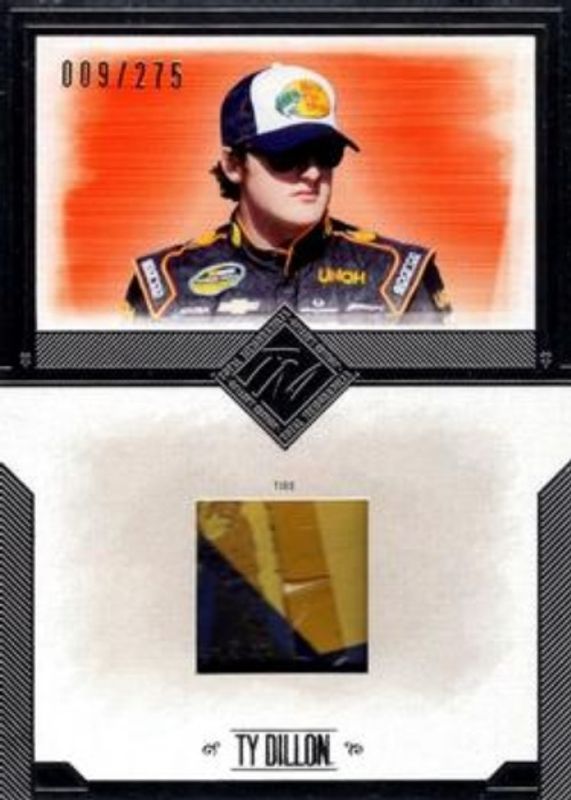 The Ty Dillon 2014 Press Pass Total Memorabilia #TM-TD Total Memorabilia Silver Single /275 card is 1 of 12 Ty Dillon's card variations in the 2014 Press Pass Total Memorabilia set being tracked by Sports Card Investor, including Base, Red, Gold /175, Black & White /99, and Total Memorabilia Gold Dual /150.
