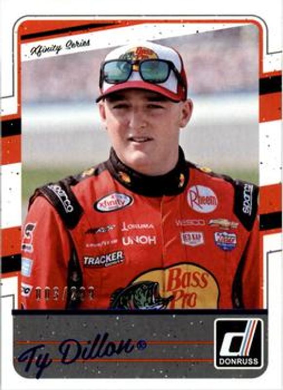 The Ty Dillon 2017 Donruss NASCAR #81 Blue Foil /299 Rookie card is 1 of 28 Ty Dillon's card variations in the 2017 Donruss NASCAR set being tracked by Sports Card Investor, including #81 Base, #28 Base, #28 Gold Foil /499, #81 Gold Foil /499, and #28 Blue Foil /299.