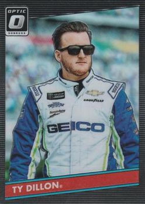 The Ty Dillon 2019 Donruss NASCAR #60 Optic card is 1 of 31 Ty Dillon's card variations in the 2019 Donruss NASCAR set being tracked by Sports Card Investor, including #133 Base, #133 Silver, #61 Black /199, #133 Black /199, and #61 Gold Press Proof /99.