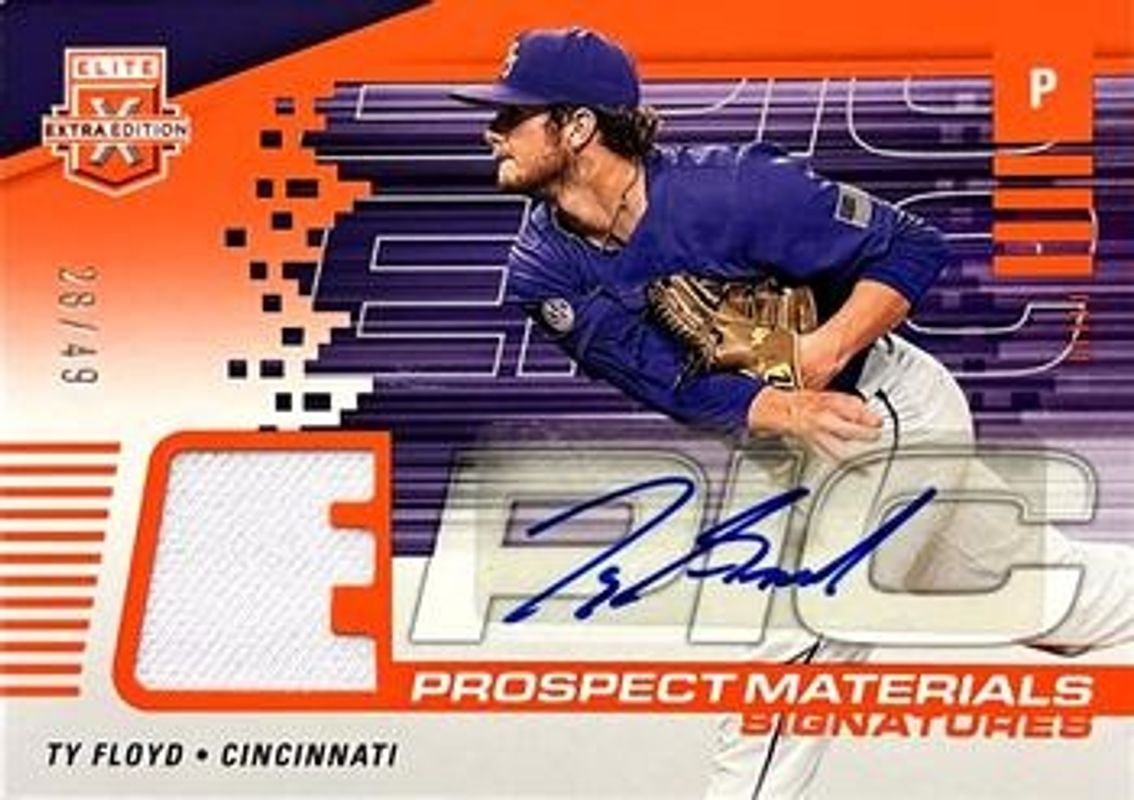 The Ty Floyd 2023 Elite Extra Edition #EMS-TF Epic Prospect Materials Signatures - Orange /49 card is 1 of 78 Ty Floyd's card variations in the 2023 Elite Extra Edition set being tracked by Sports Card Investor, including Base, Pink, Signatures, Status Green /499, and Signatures die-cut /399.